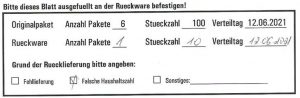 leider erreichen uns immer noch Information von den Auslieferfahrerinnen und Fahrern, dass übrig gebliebene Verteilware bei der Rückgabe in der Folgewoche nicht richtig gekennzeichnet ist. Bitte achtet deshalb darauf das Deckblatt korrekt auszufüllen. Nicht gekennzeichnete und gebündelte Ware kann nicht mehr mitgenommen werden. Solltet ihr Fragen zum Ausfüllen des Deckblattes haben, könnt ihr euch gerne an eure Gebietsbetreuerin oder euren Gebietsbetreuer wenden.